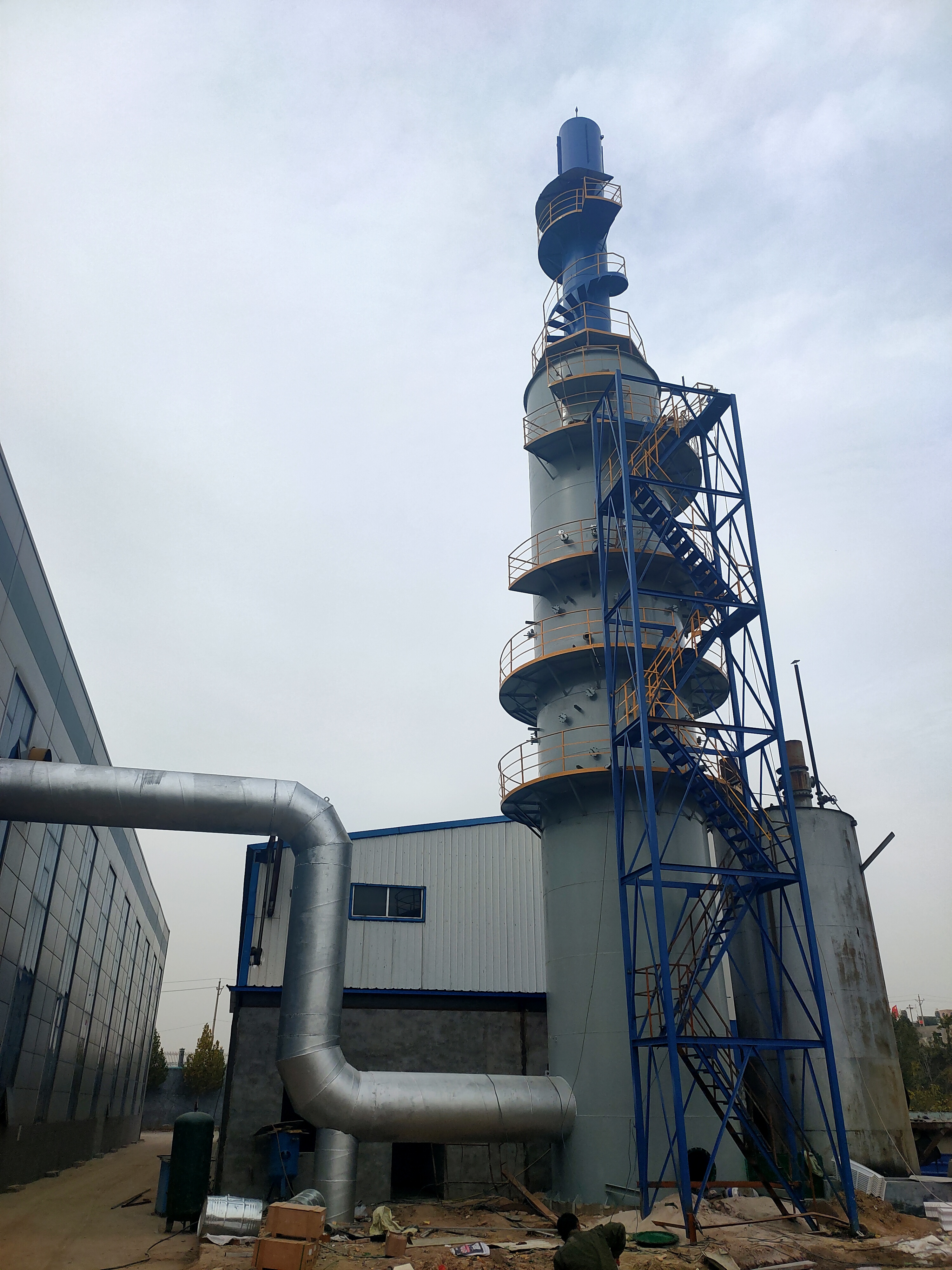 在热量交换后烟气进入逆流喷淋吸收塔,与从吸收塔喷上部喷出的的雾状石灰石浆液接触进行脱硫反应,烟气中的SO2、SO3等被吸收塔内循环喷淋的石灰石浆液洗涤,并与浆液中的CaCO3发生反应生成的亚硫酸钙悬浮颗粒在吸收塔底部的循环浆池内,再次被氧化风机鼓入的空气强制氧化而继续发生化学反应,生成石膏颗粒。经过充分氧化生成的脱硫副产品石膏浆体,离脱水后的底流石膏浆进行过滤脱水处理,石膏成品堆积在脱硫石膏仓待运。